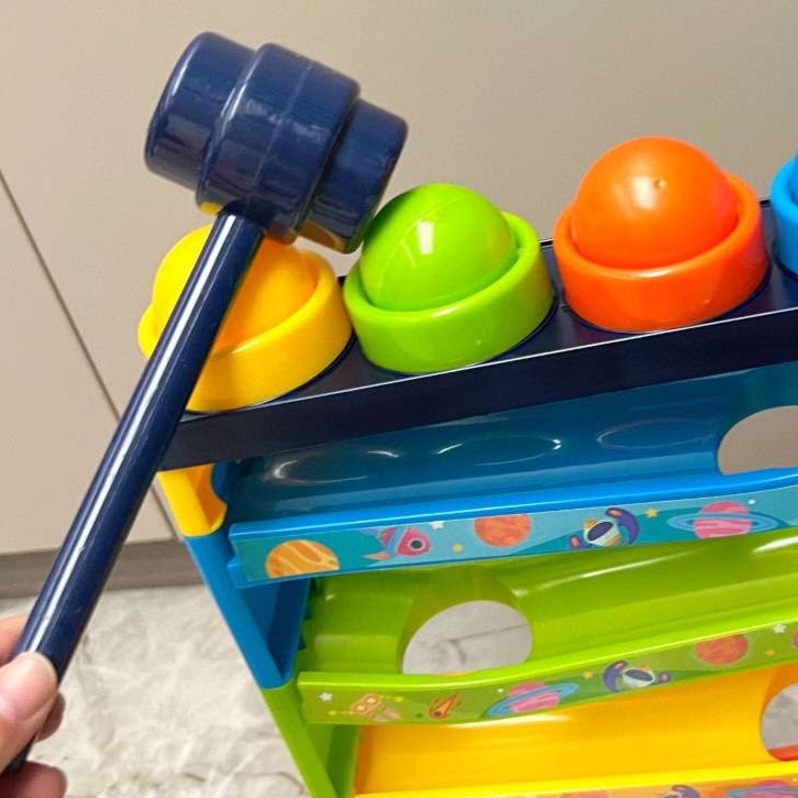 この知育玩具は、ハンマーで玉を叩いて転がす動作を通じて、手指の器用さと集中力を同時に育めます。