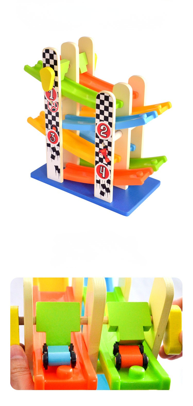 4段の坂道をミニカーが転がり落ちる様子を目で追うことで追視力を養い、数字やチェッカー柄のデザインで数の概念や視覚認識を育みます。