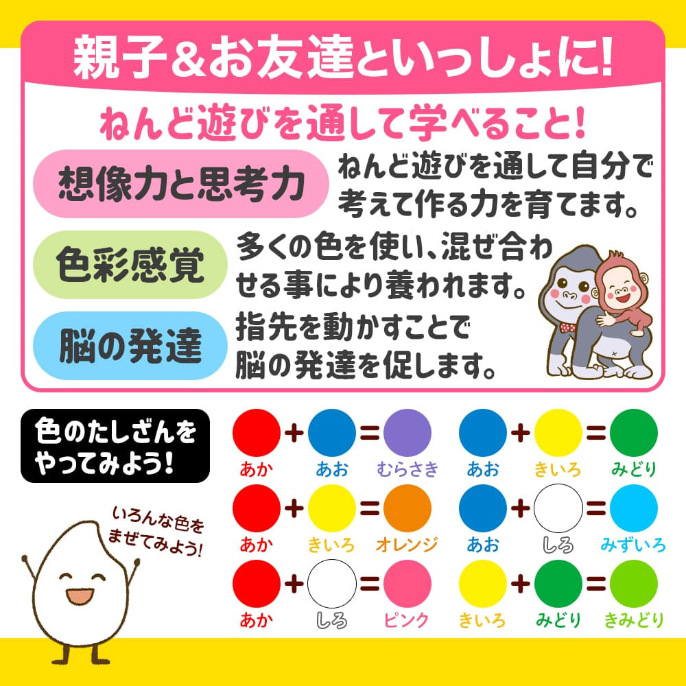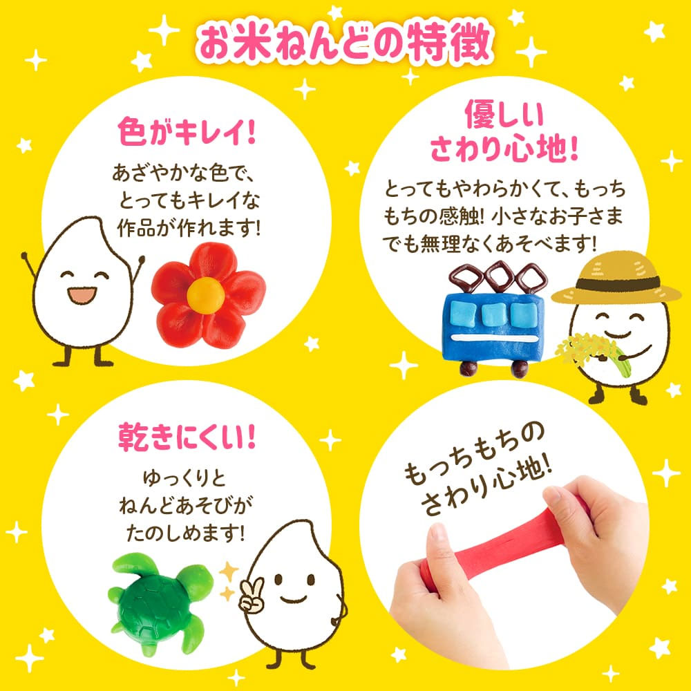 米粉でつくったもちもちやわらかなねんどで、小さなお子さまでも簡単にこねられます。