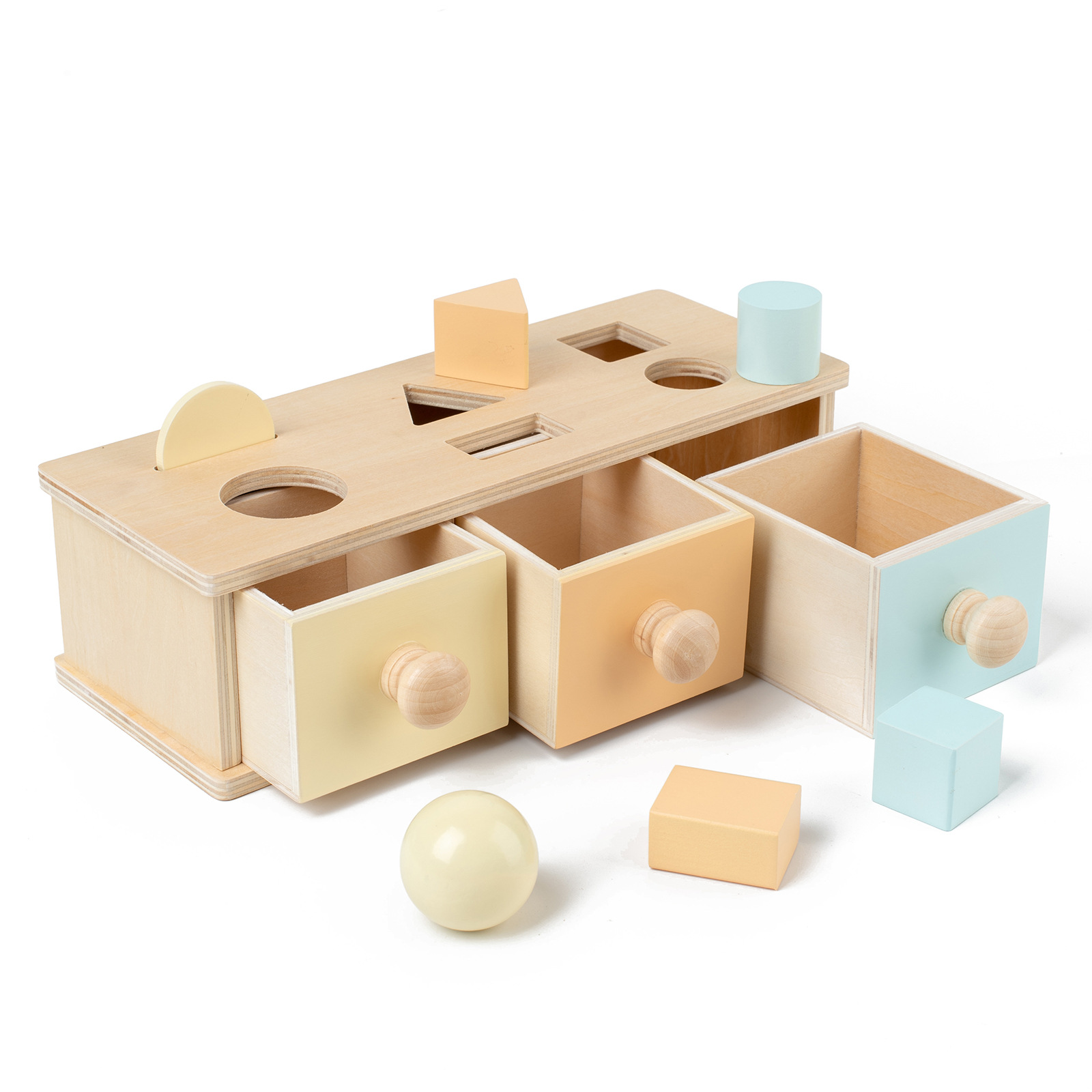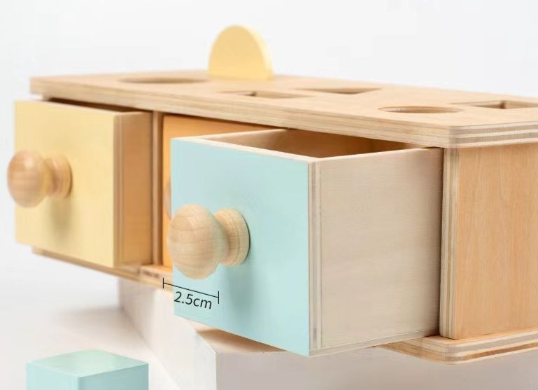 形の違いを認識しながら正しい穴に積み木を入れる形合わせ遊びと、引き出しを開閉する動作を組み合わせた木製パズルボックスです。