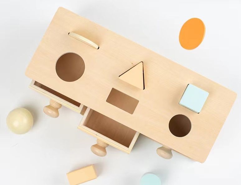 丸、三角、四角など様々な形のブロックを穴に通して引き出しの中に収納することで、形の認識力や手先の器用さ、問題解決能力を育みます。