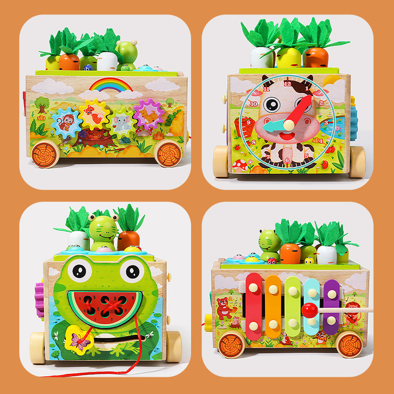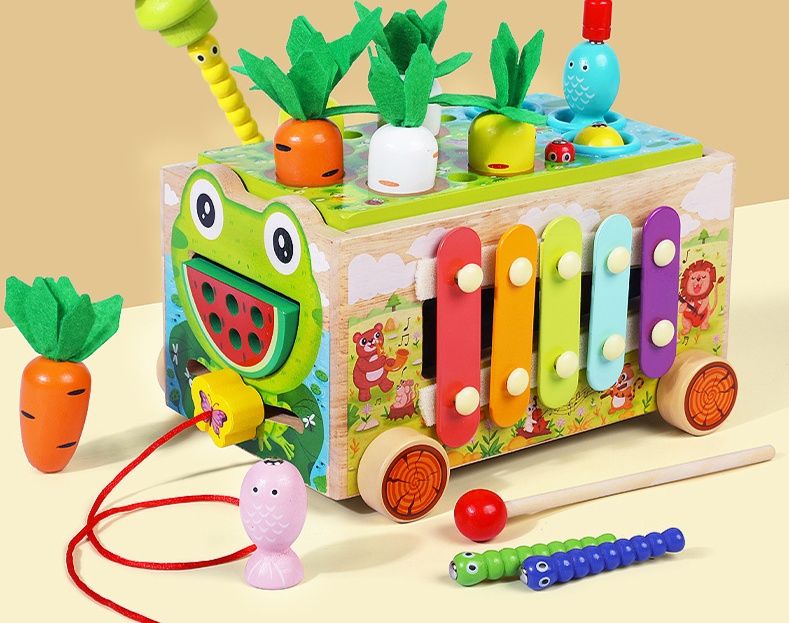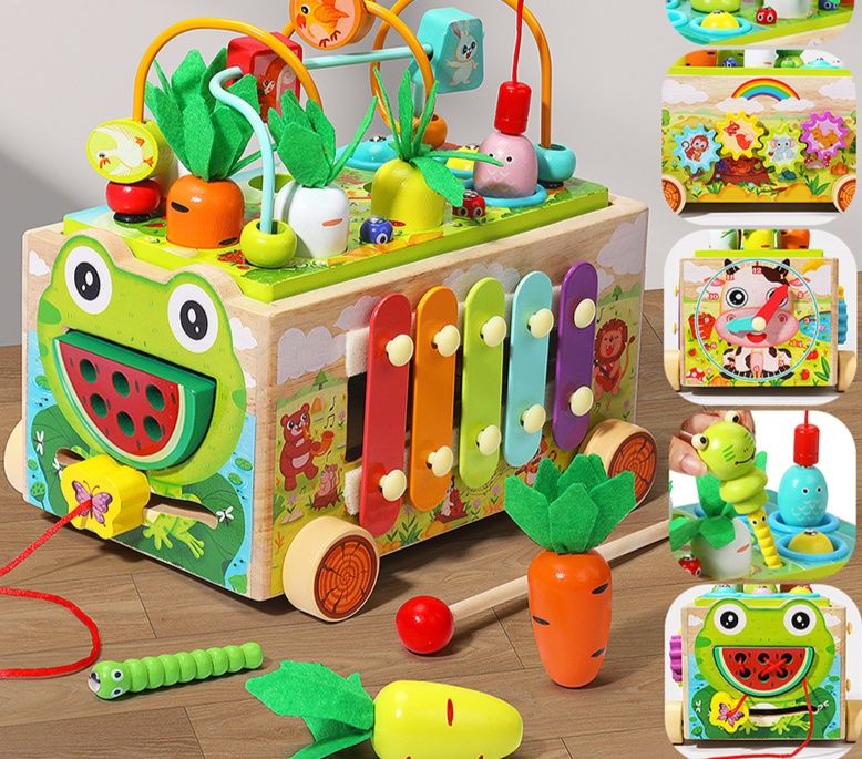 かわいいかえるの顔が目印の木製押し車に、ビーズコースター、木琴、釣り遊び、型はめパズル、迷路など様々な仕掛けが詰まっています。