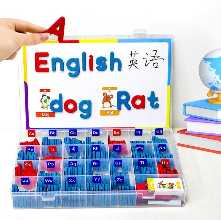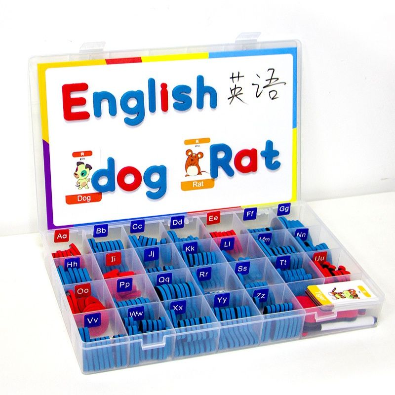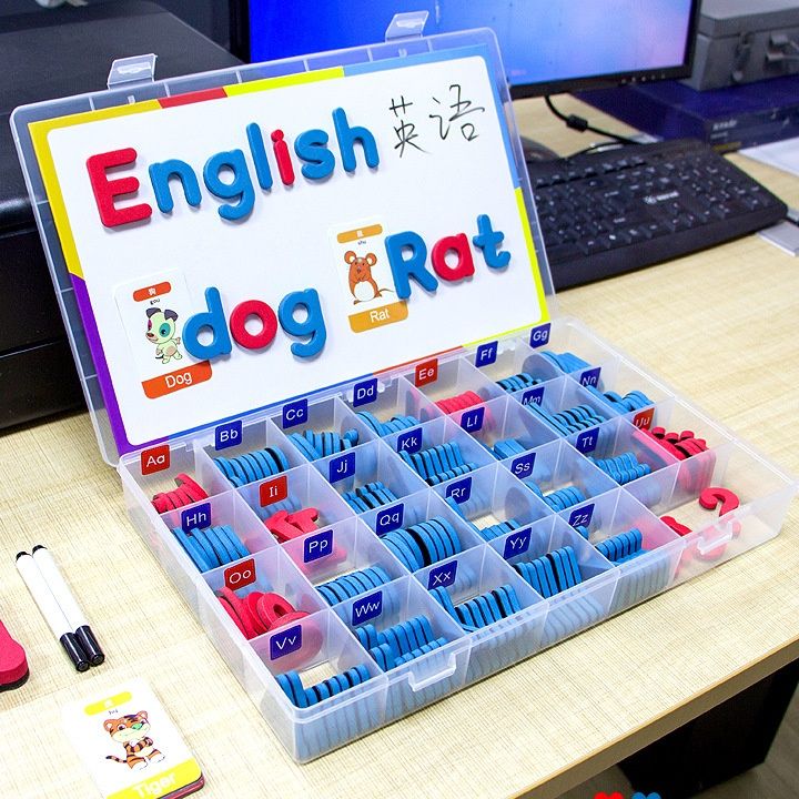 大文字小文字のマグネット式文字パーツと算数記号が収納ケースに整理され、ホワイトボードに自由に貼り付けて学習できます。