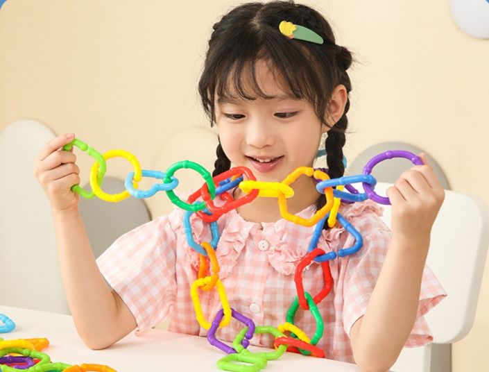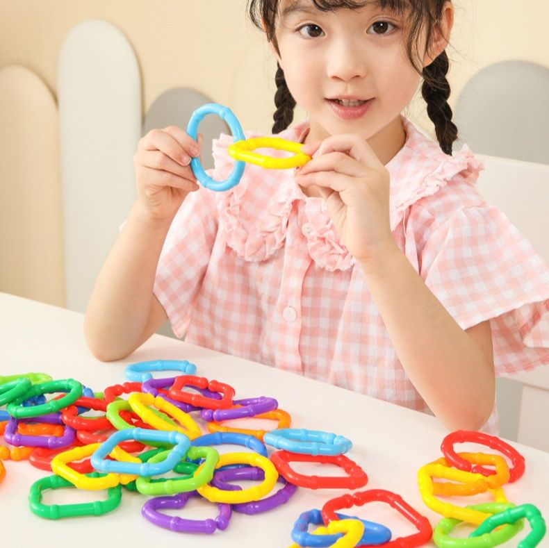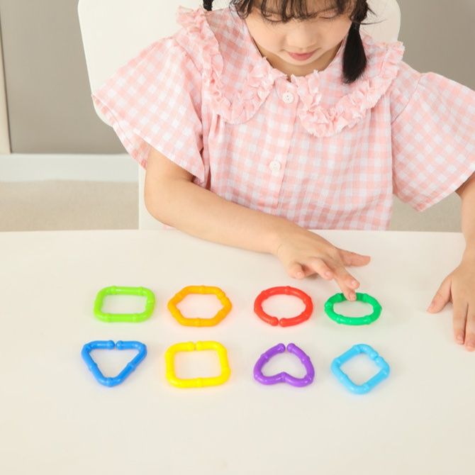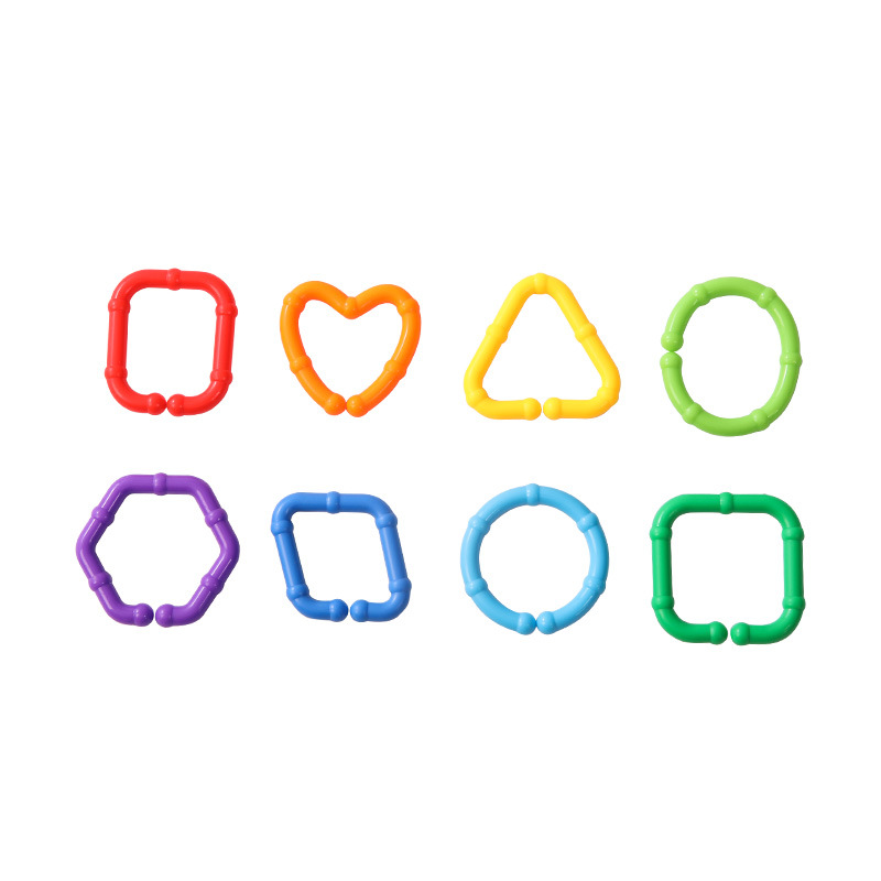 丸や三角、四角やハート型など様々な形の輪っかをつなげて遊ぶ知育玩具です。