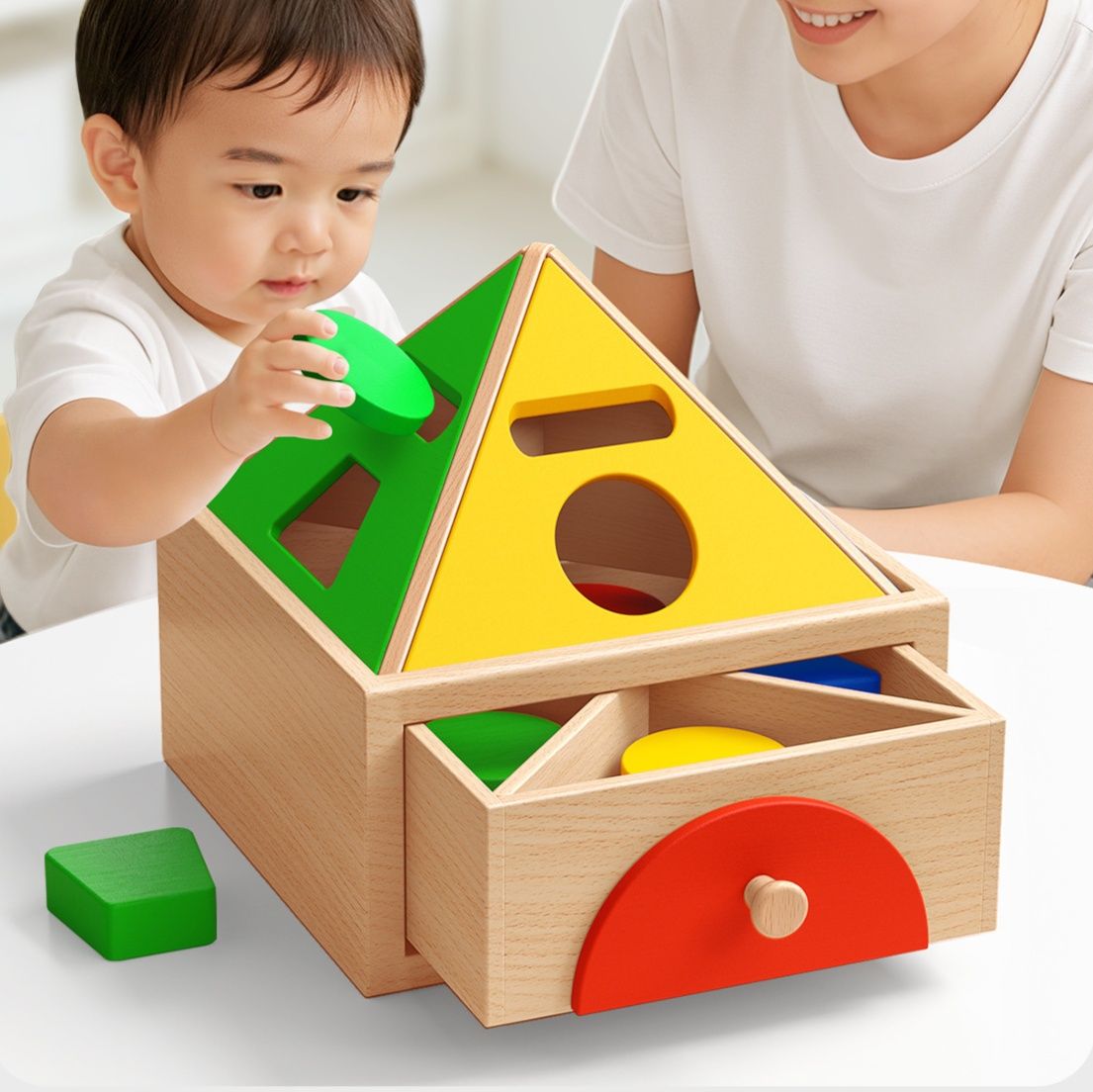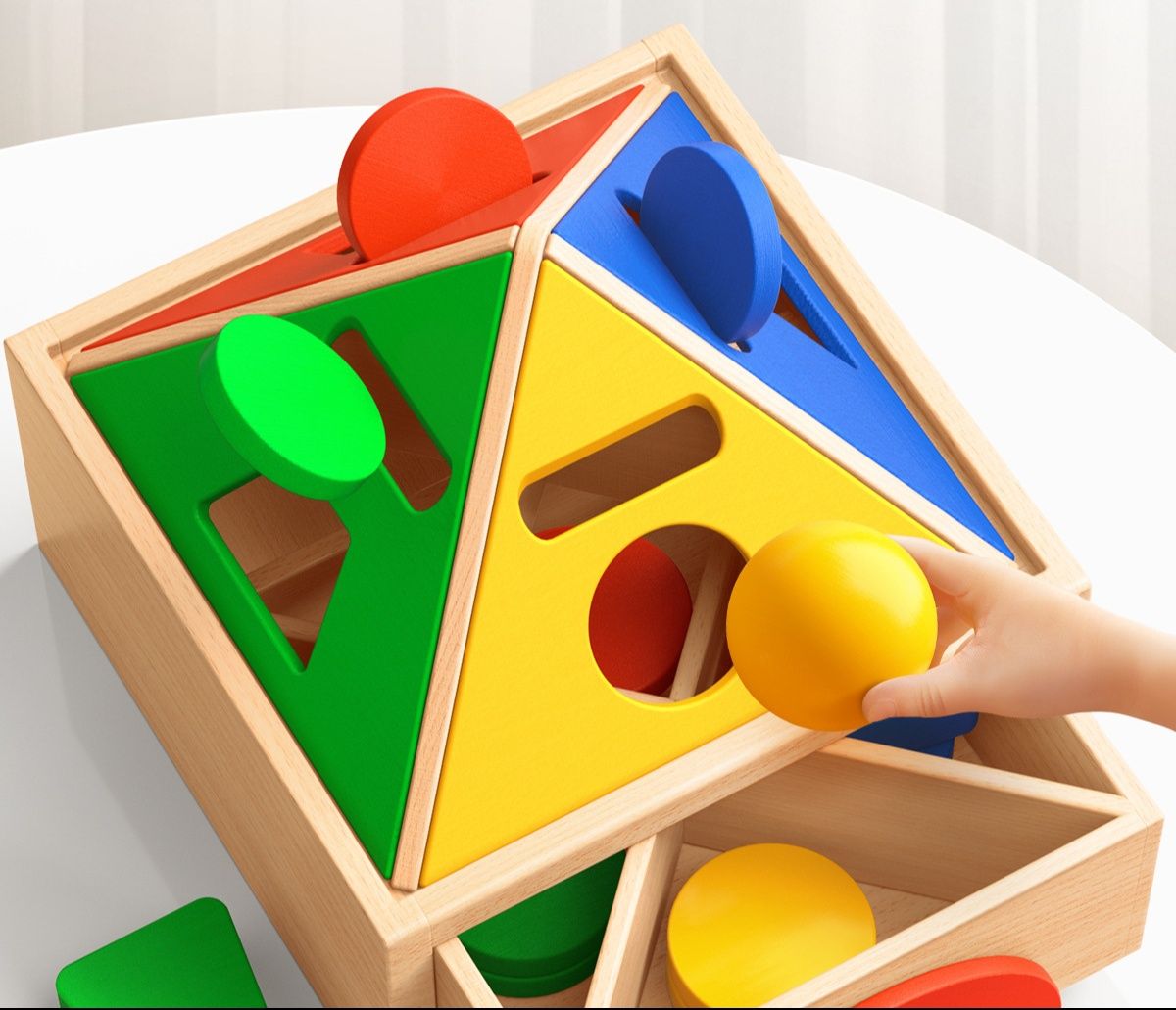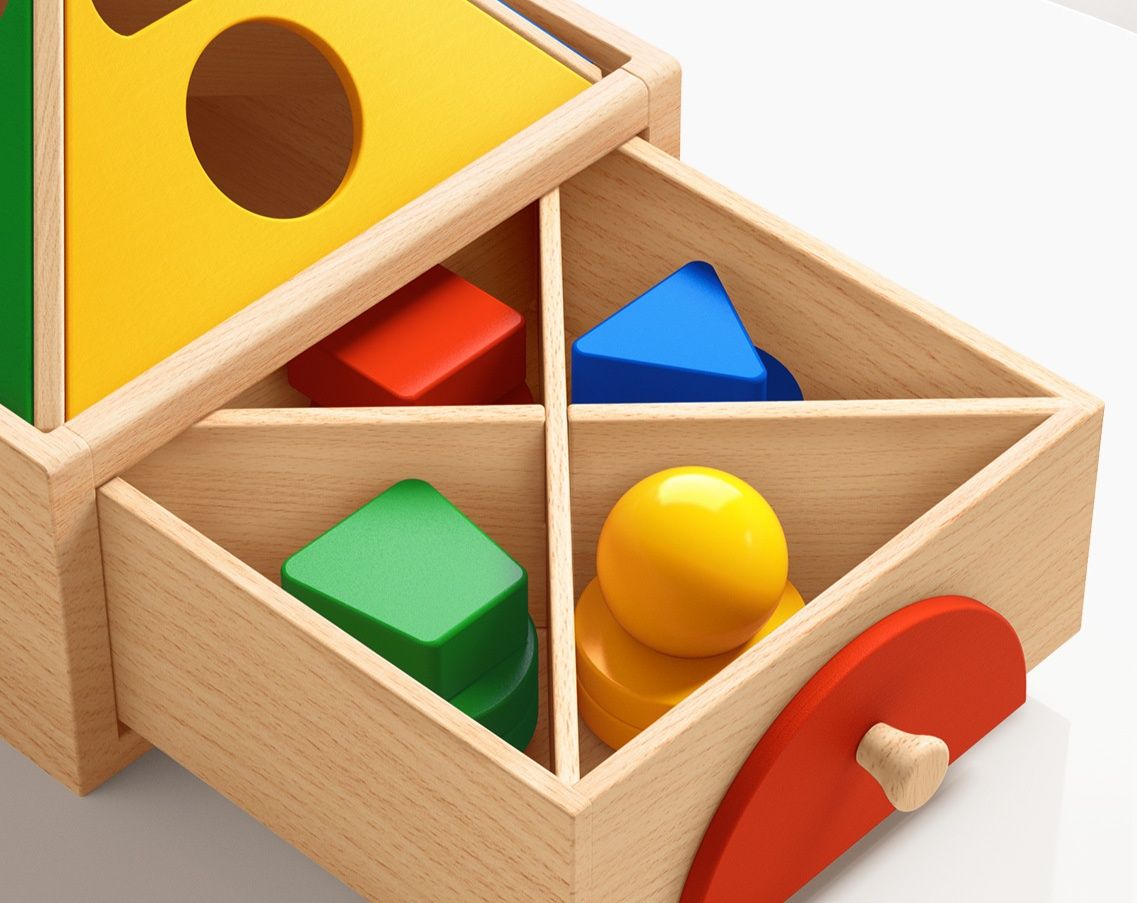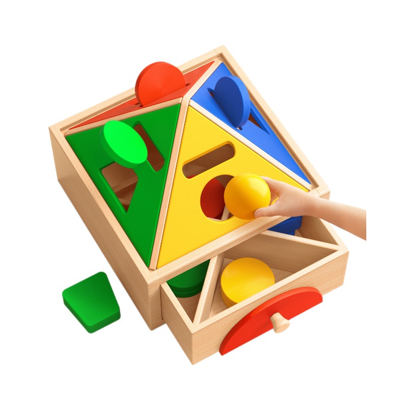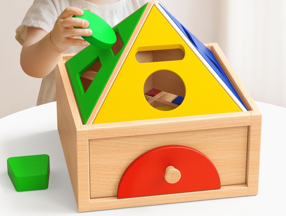 三角や丸などの様々な立体図形を対応する穴にはめこむことで、形の認識力と空間把握能力を育みます。