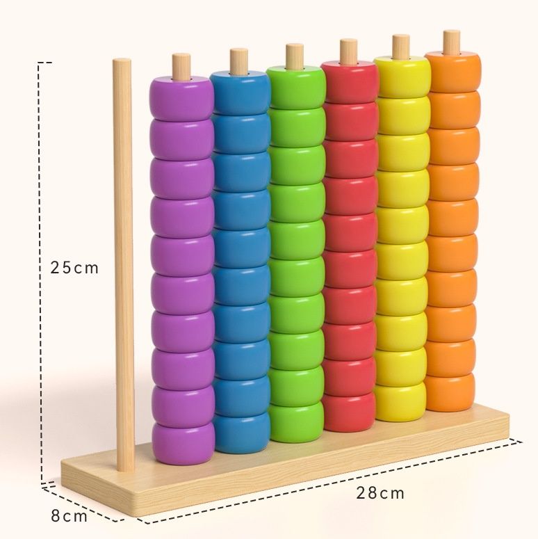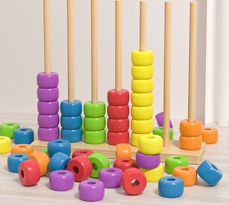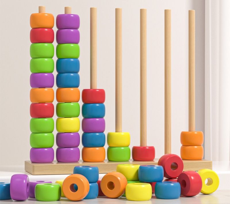 木製の棒に高さの異なるリングを重ねることで、数の大小や順序を視覚的に理解できます。