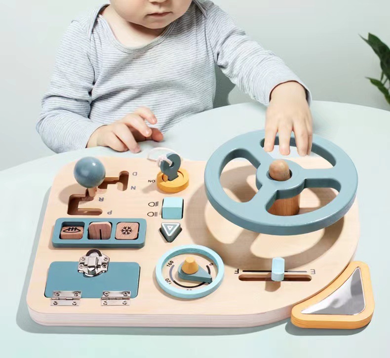 ハンドル、ダイヤル、鍵、ボタンなど様々な仕掛けが詰まった木製の操作パネル型知育玩具です。