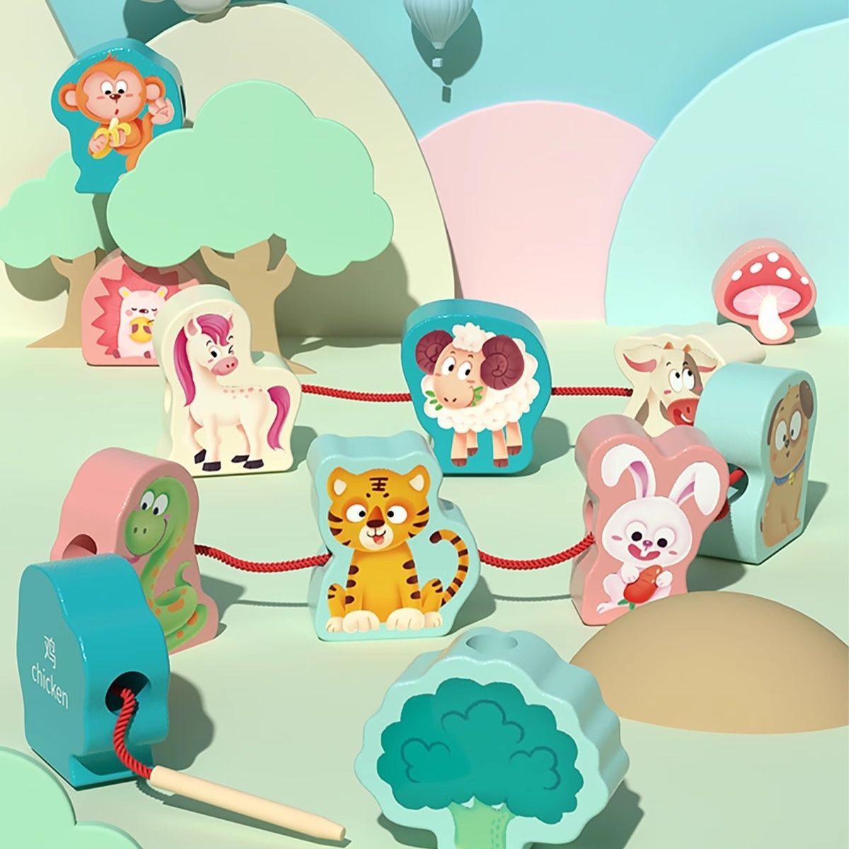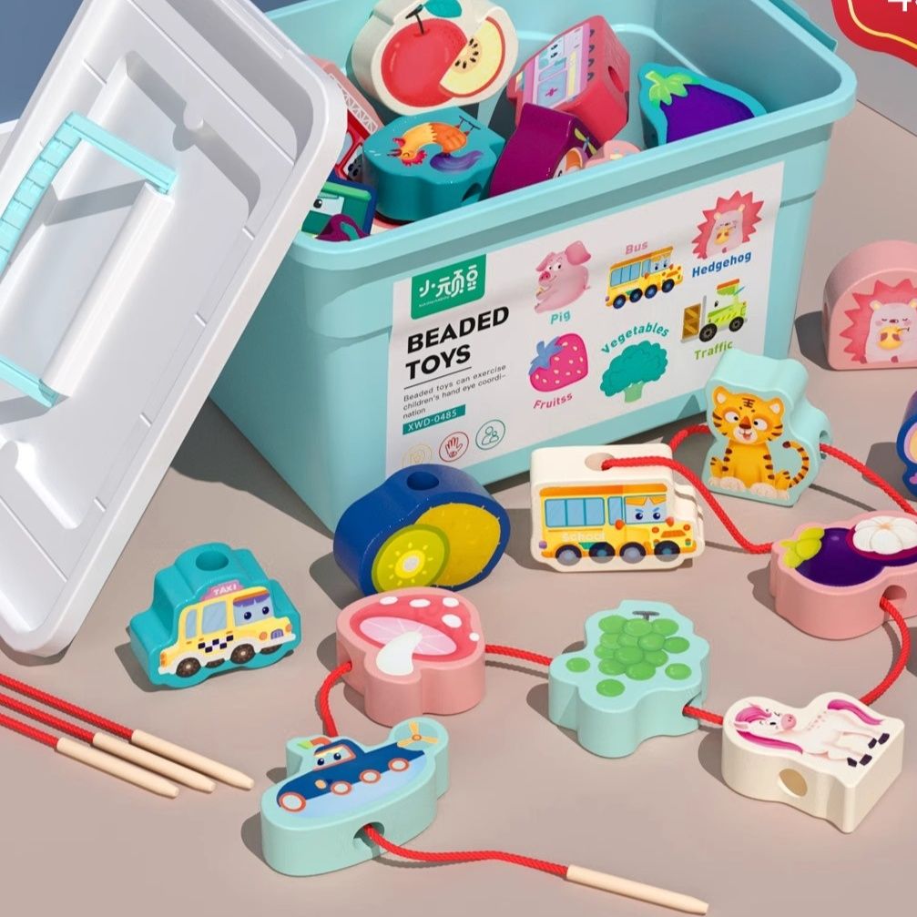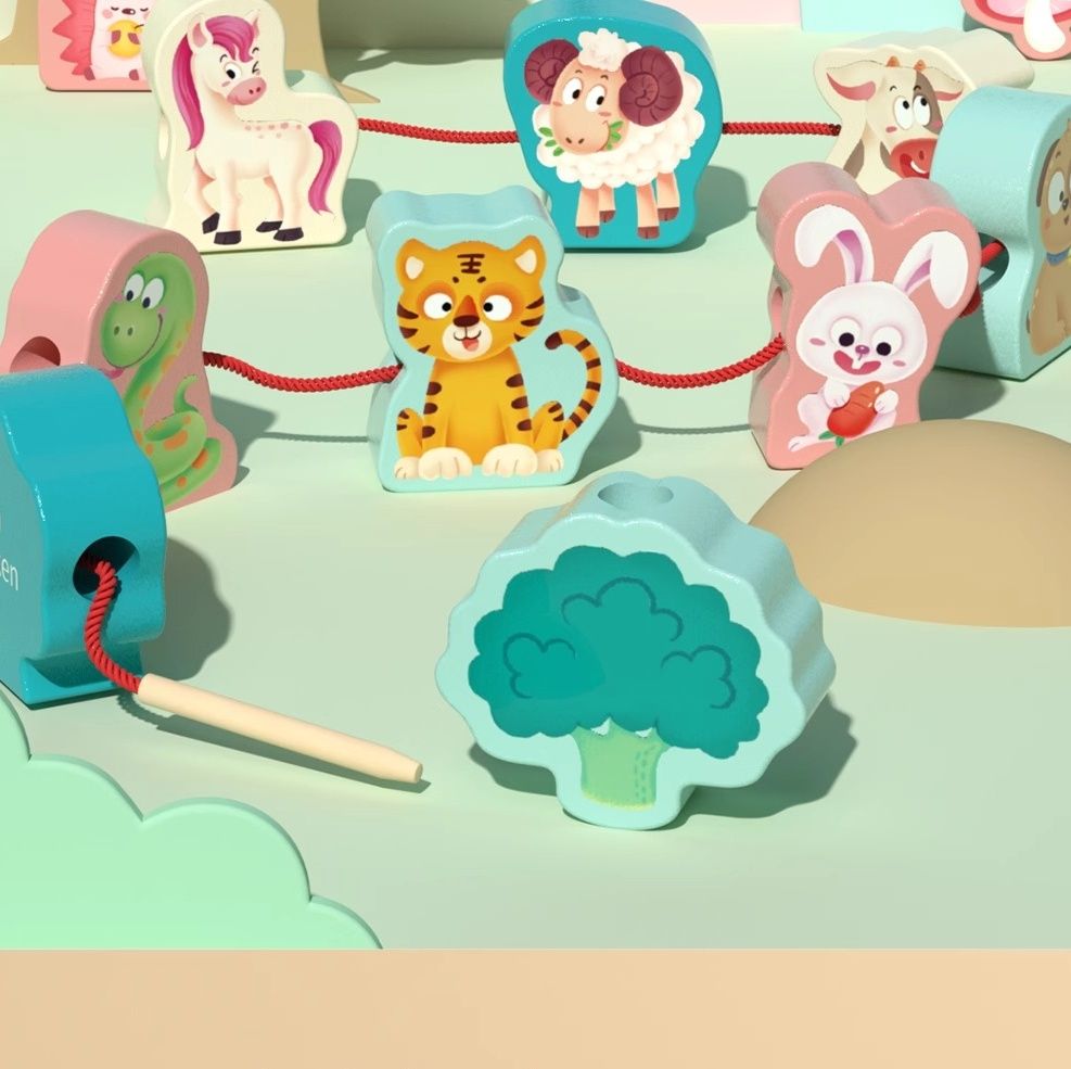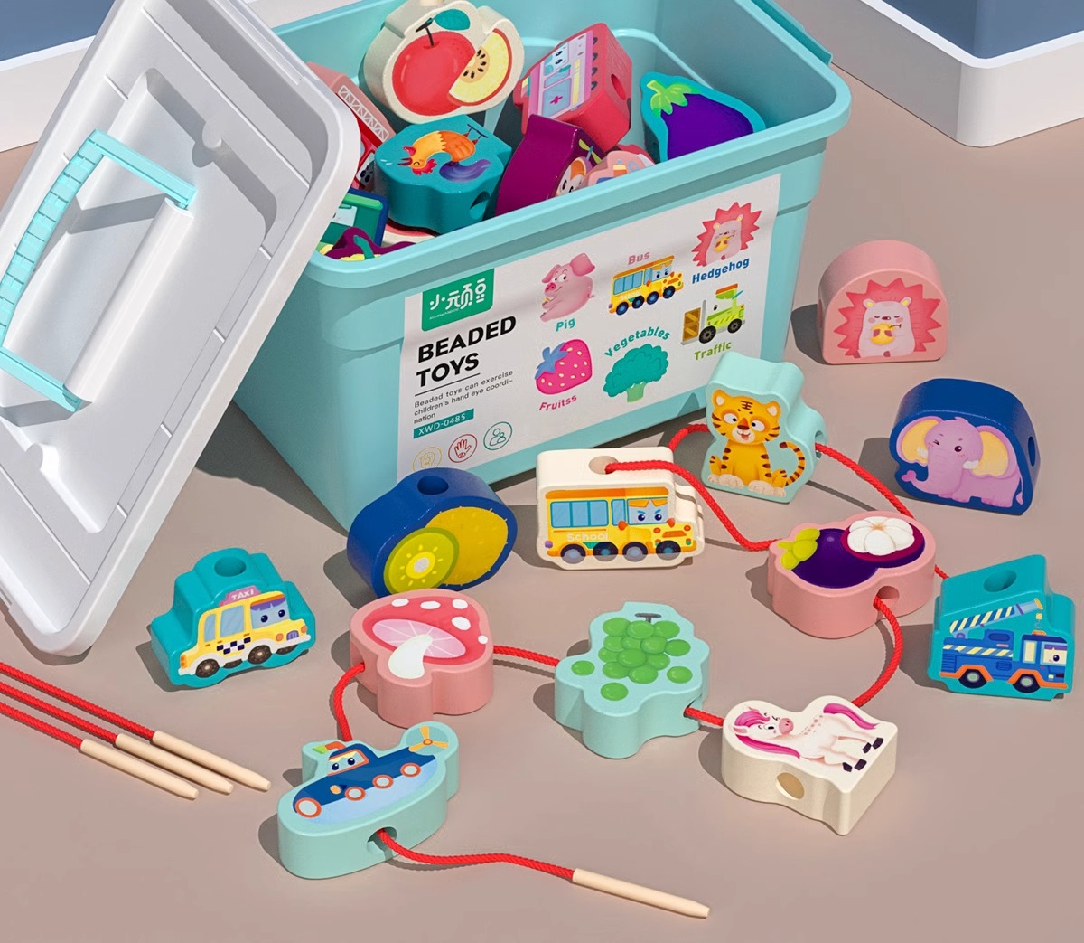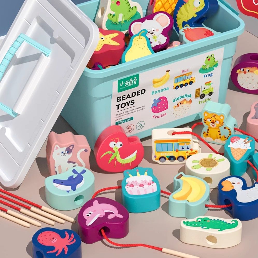 可愛い動物や乗り物の形をした木製ブロックに紐を通して遊ぶ知育玩具です。
