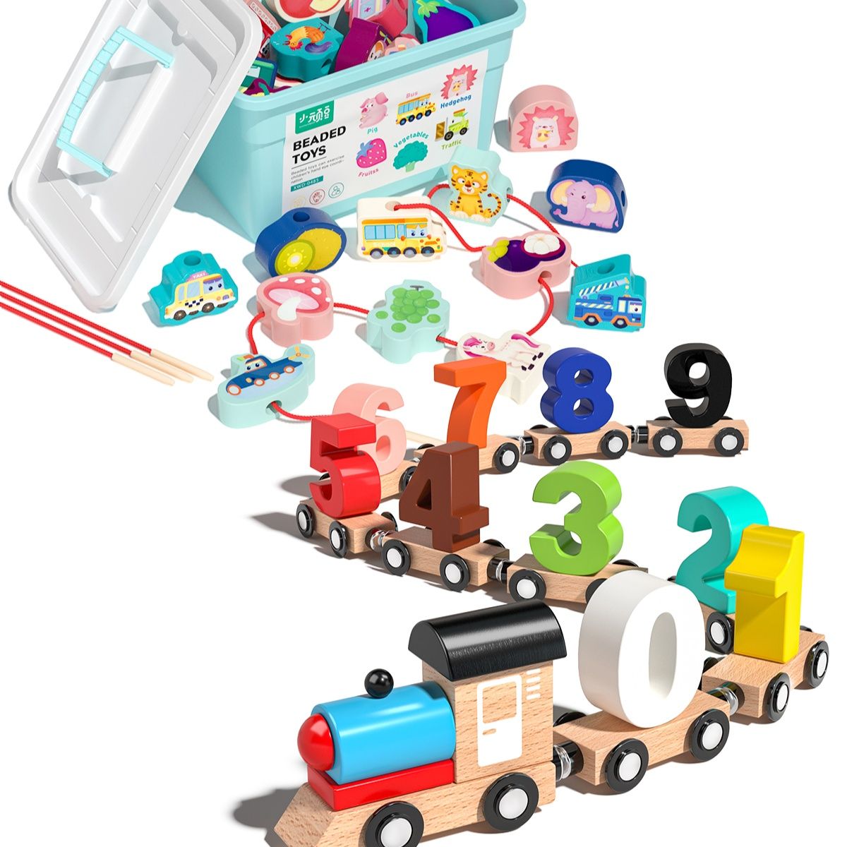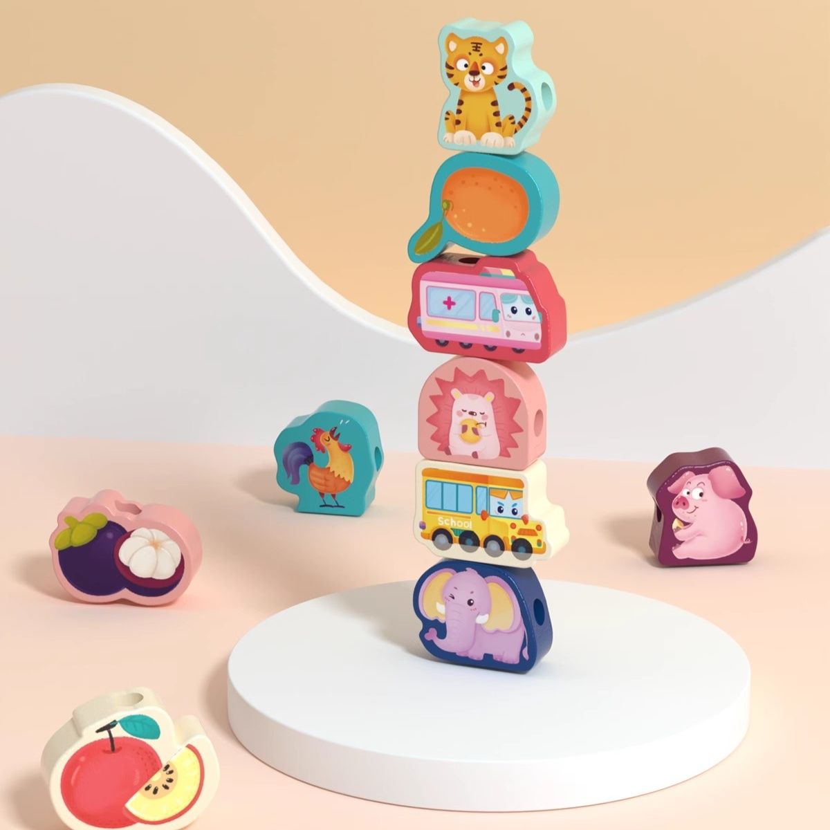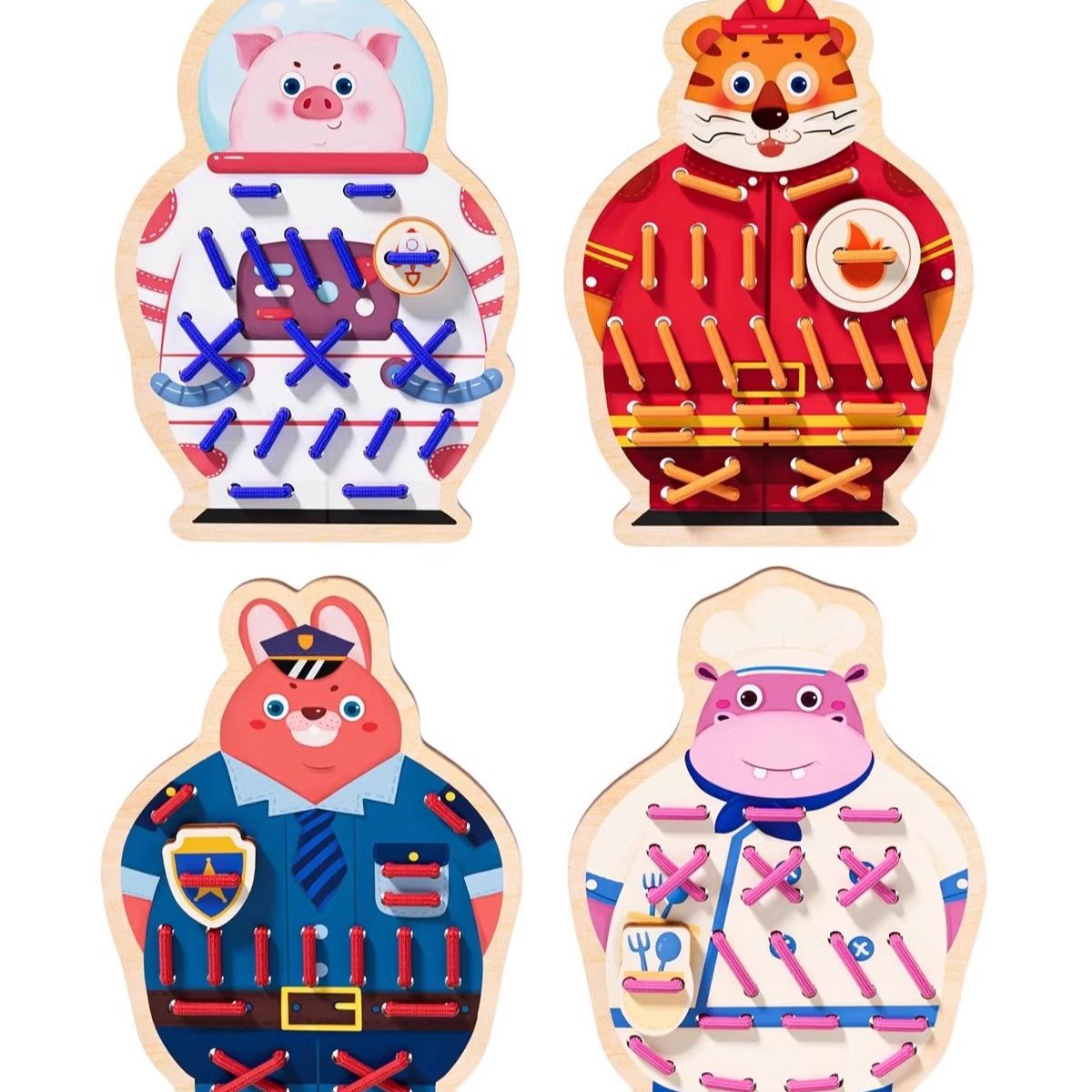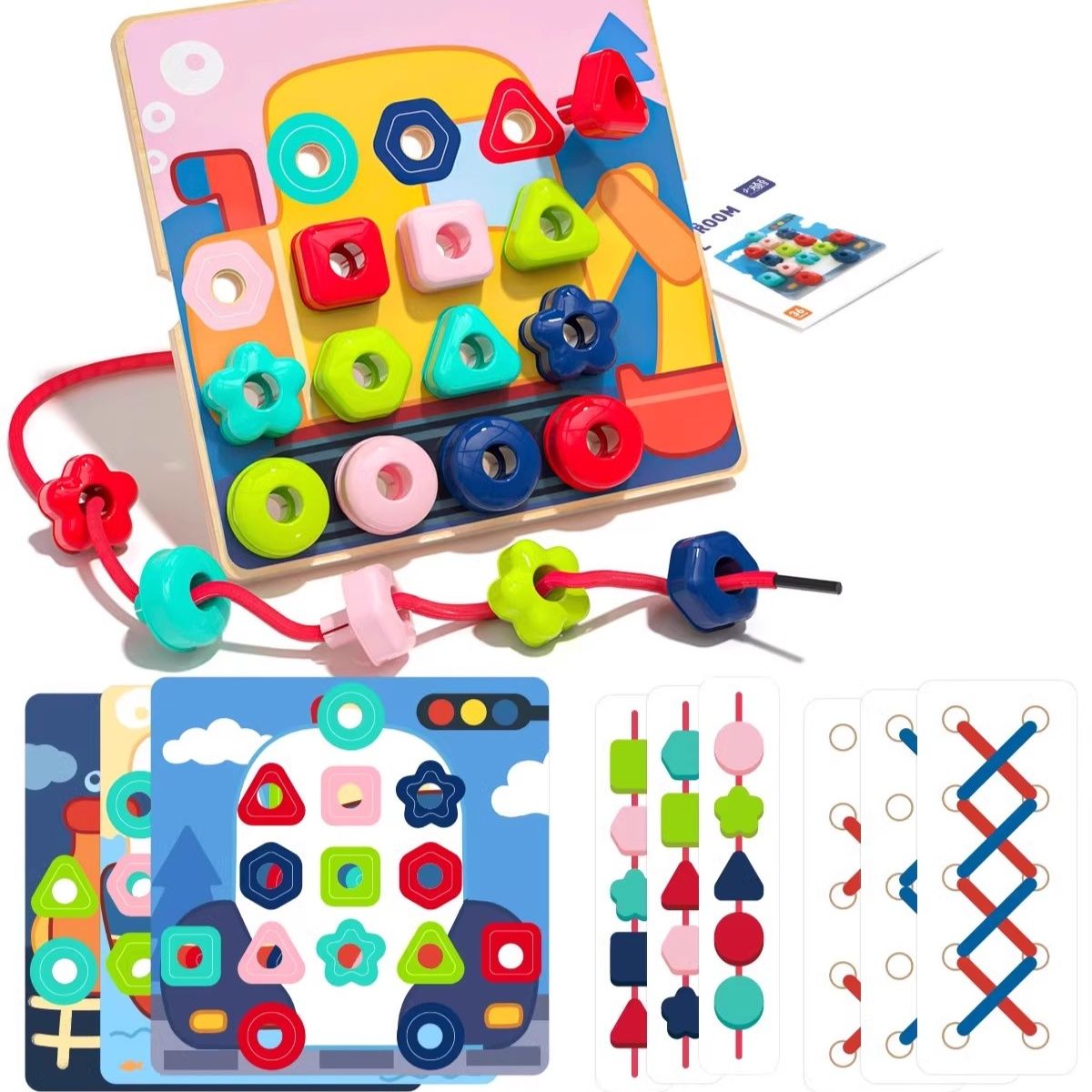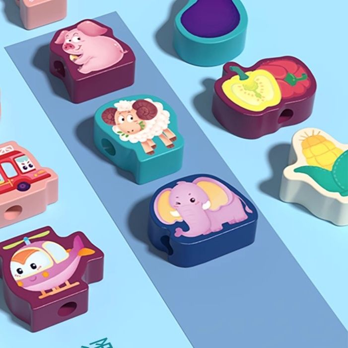 可愛い動物や乗り物の形をした木製ブロックに紐を通して遊ぶ知育玩具です。