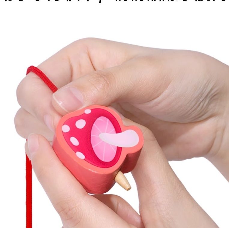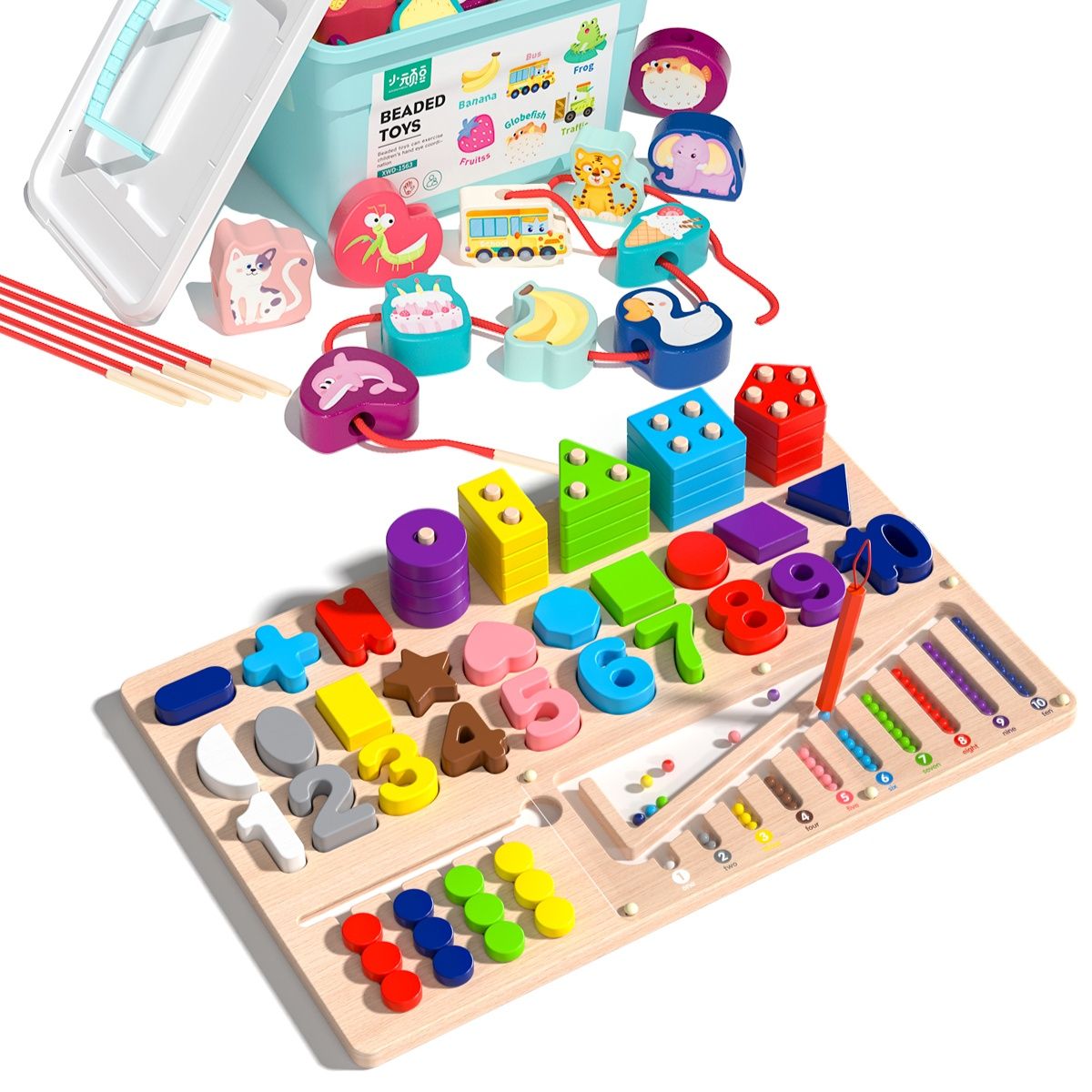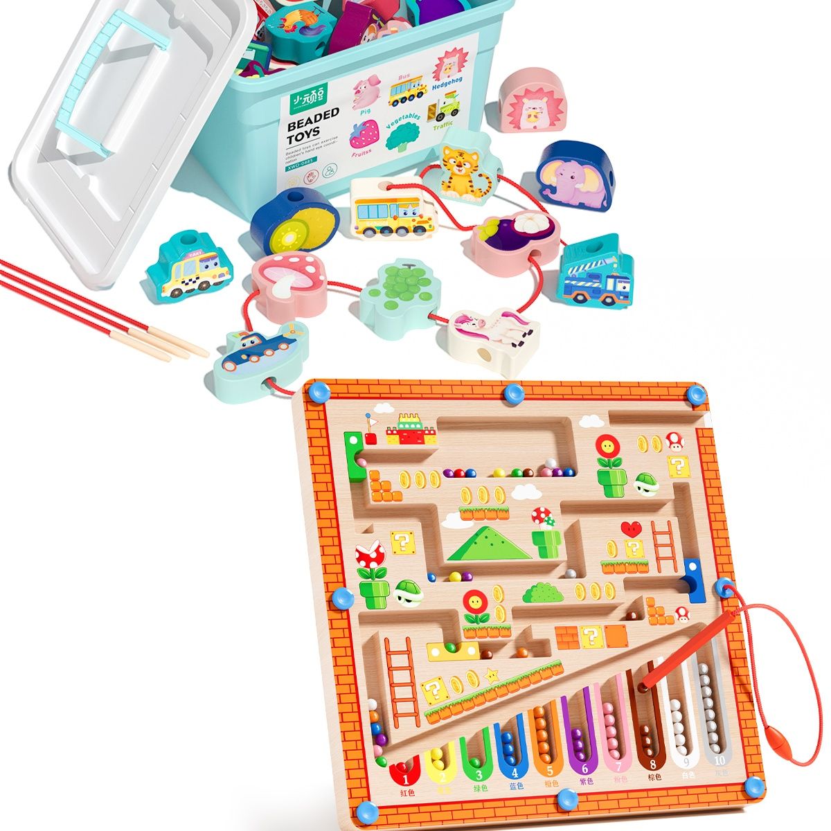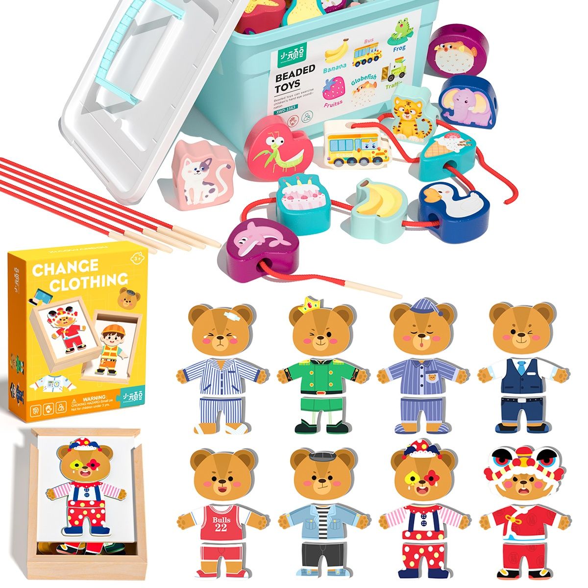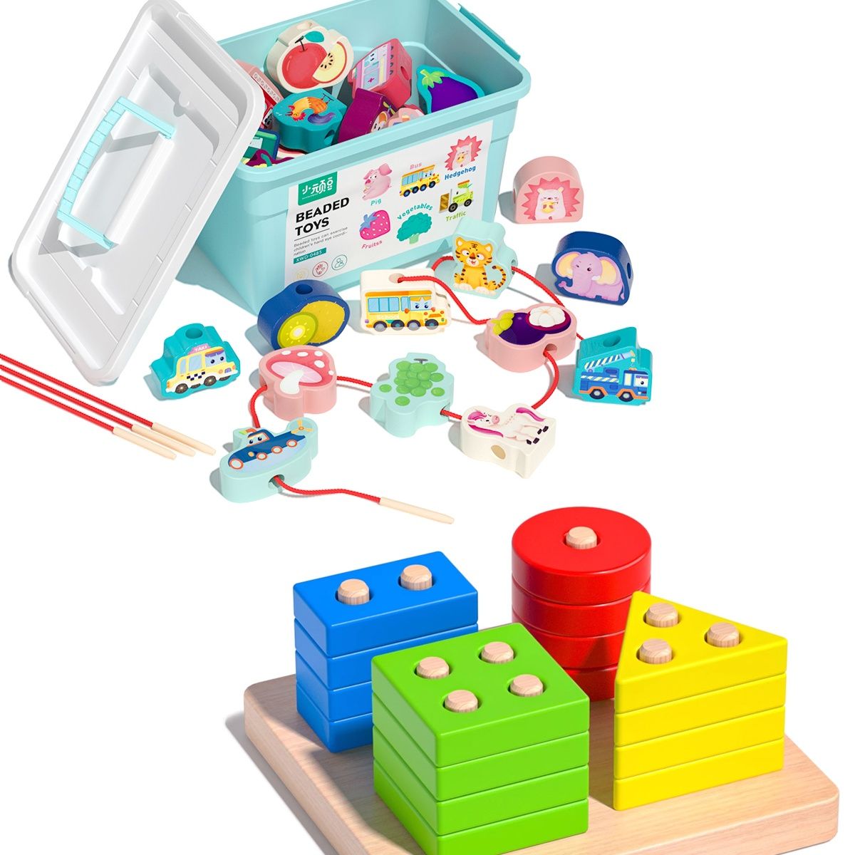 可愛い動物や乗り物の形をした木製ブロックに紐を通して遊ぶ知育玩具です。