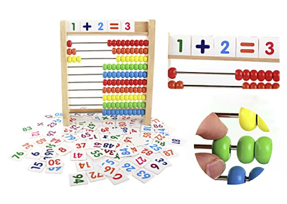 10段のカラフルな百玉そろばんと数字カードがセットになった知育玩具です。