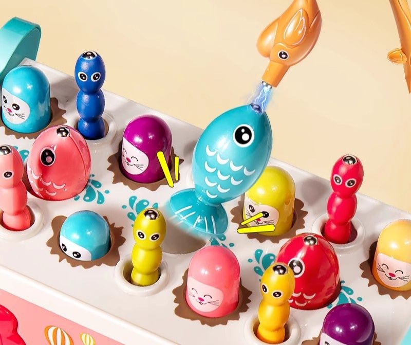 磁石の釣り遊びで手と目の協調性を育み、叩き遊びで反応速度を鍛えます。