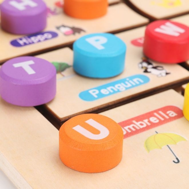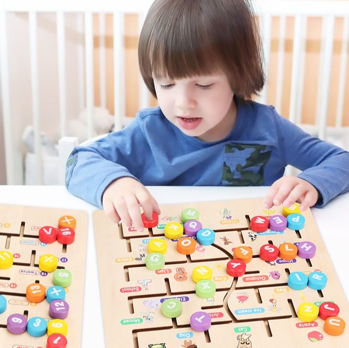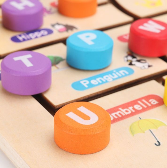 アルファベットが書かれた丸いピースを迷路に沿って動かしながら、英語の単語と文字を楽しく学べる知育玩具です。